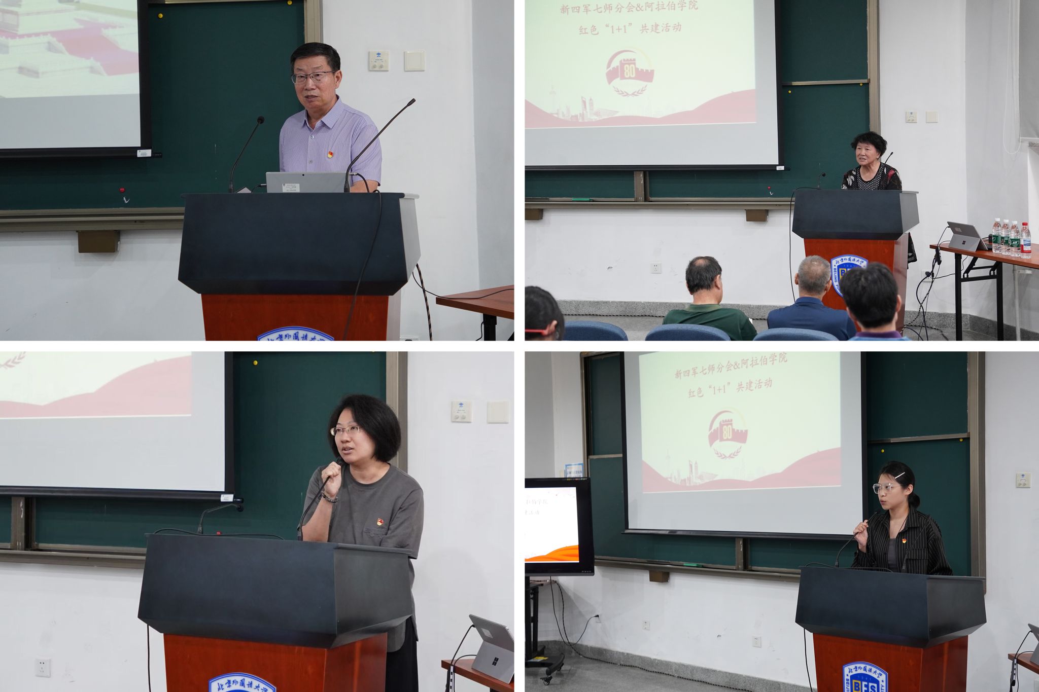 仪式结束后,新四军研究会七师分会秘书长桂琦同志发表感想,他表示阅兵仪式既是检阅也是锻造,展现出人民军队的精神面貌和中国坚定维护世界和平的大国担当。副会长李晓帆同志结合父辈和个人经历,向公司师生提出期望,鼓励大家传承好红色血脉,勇挑时代重担。公司教师代表孟炳君则激励学子们将个人发展融入到时代大局中,以浩然正气迎接新的挑战。员工党员李昕溪表示,将把对军旅生活的回忆、对先辈抗战精神的缅怀转化为持续奋斗的行动。新生代表耿智瑞、鲍雨霏、刘晓羲结合自身实际,分别从传承抗战精神、“一带一路”倡议为阿语学子提供发展平台及新时代中国青年的使命担当等方面分享了感悟。