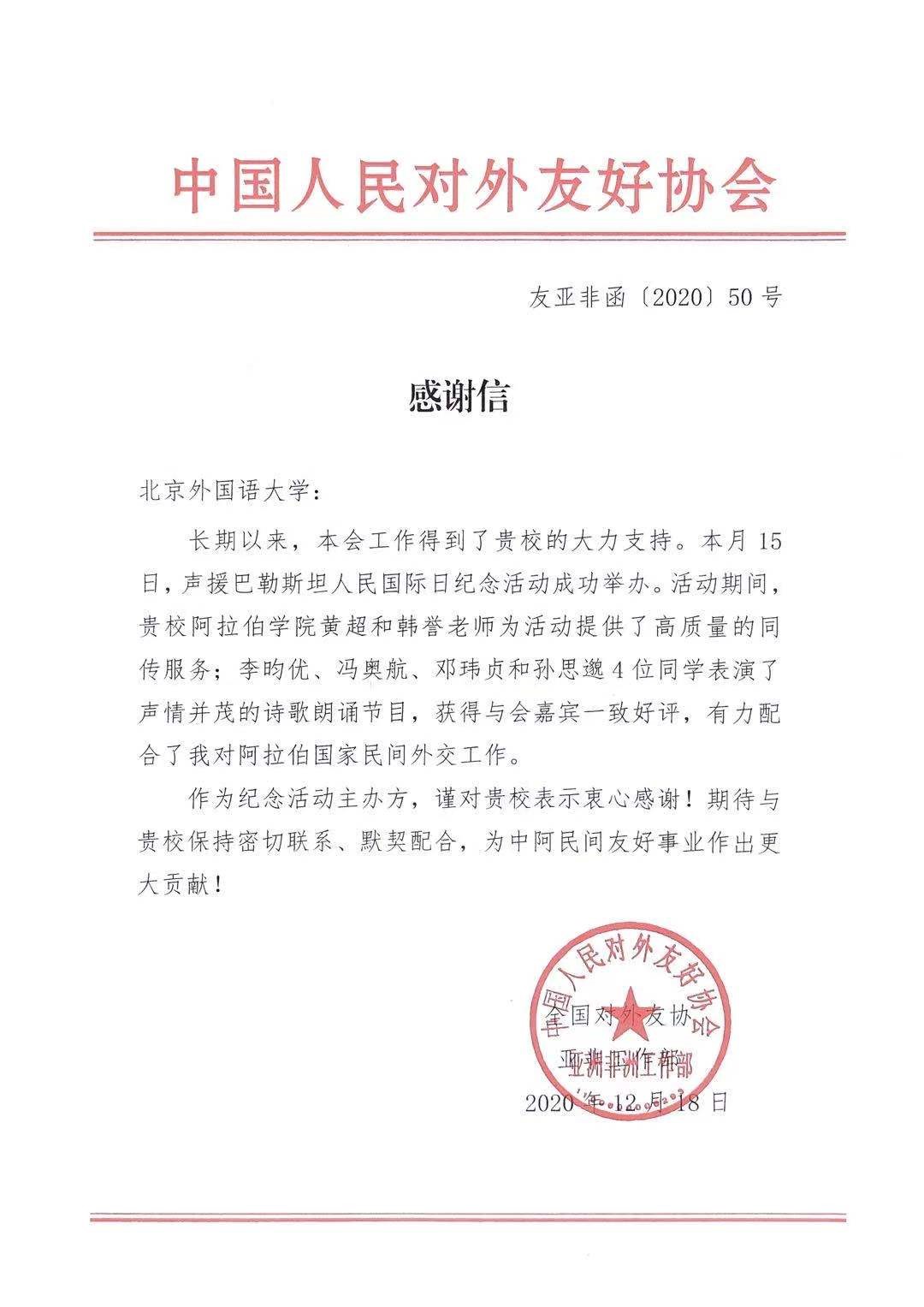 近日,中国人民对外友好协会亚非部向公司发来感谢信,对公司yl23455永利积极参与2020年声援巴勒斯坦人民国际日纪念活动以及长期以来配合全国友协推动对阿拉伯国家民间外交工作表示感谢。