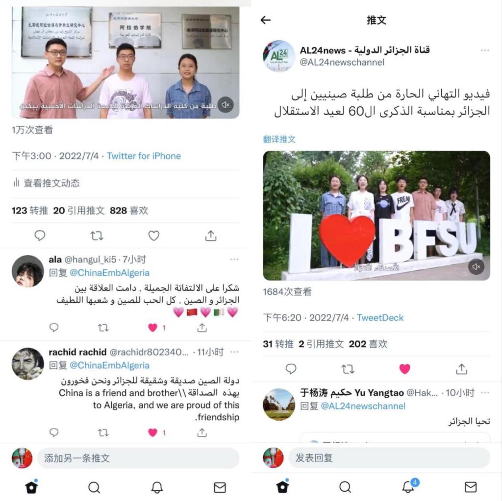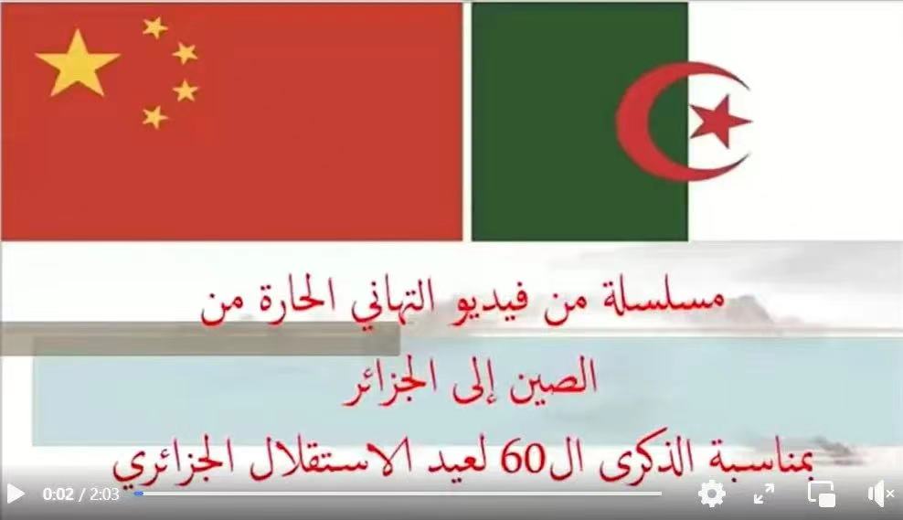 祝福视频由中国驻阿尔及利亚使馆统筹安排录制,通过中国驻阿尔及利亚使馆的社交媒体官方账号、CGTN阿拉伯语频道以及阿尔及利亚广播电台广泛转发,获得了阿尔及利亚民众的热烈反响。