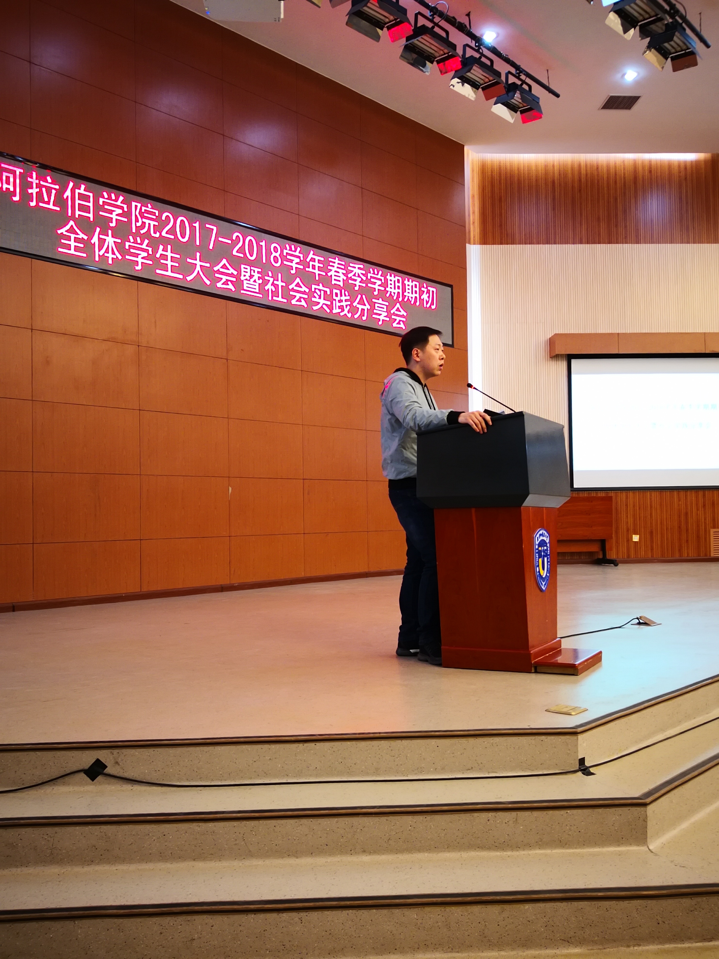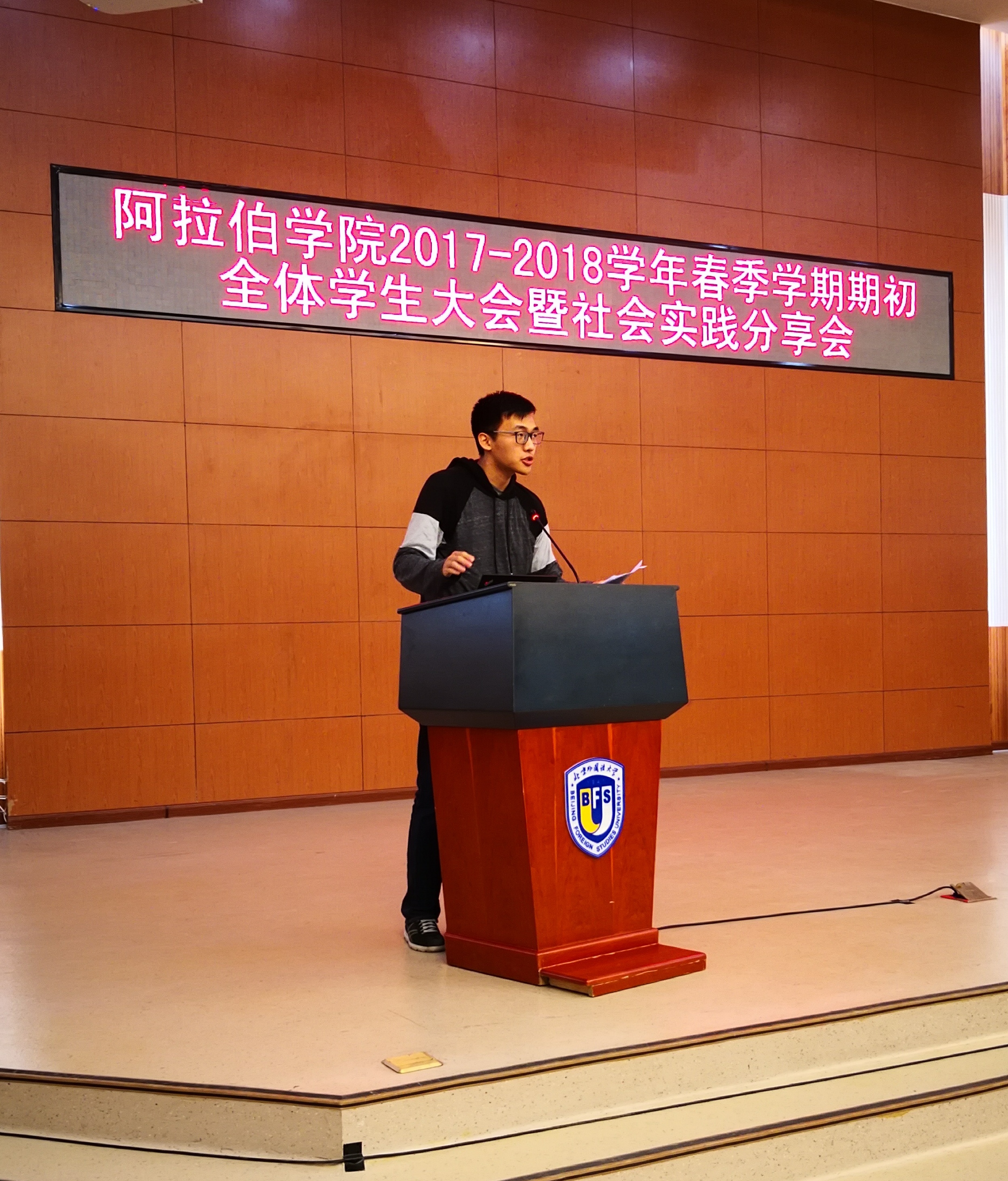 2018年3月14日下午4点,yl23455永利在阿语楼国会厅召开了“2017-2018学年春季学期初全体员工大会暨社会实践分享会”。公司党总支书记吴丹梅、副经理刘欣路、辅导员童昊,以及全体员工参加了本次大会。