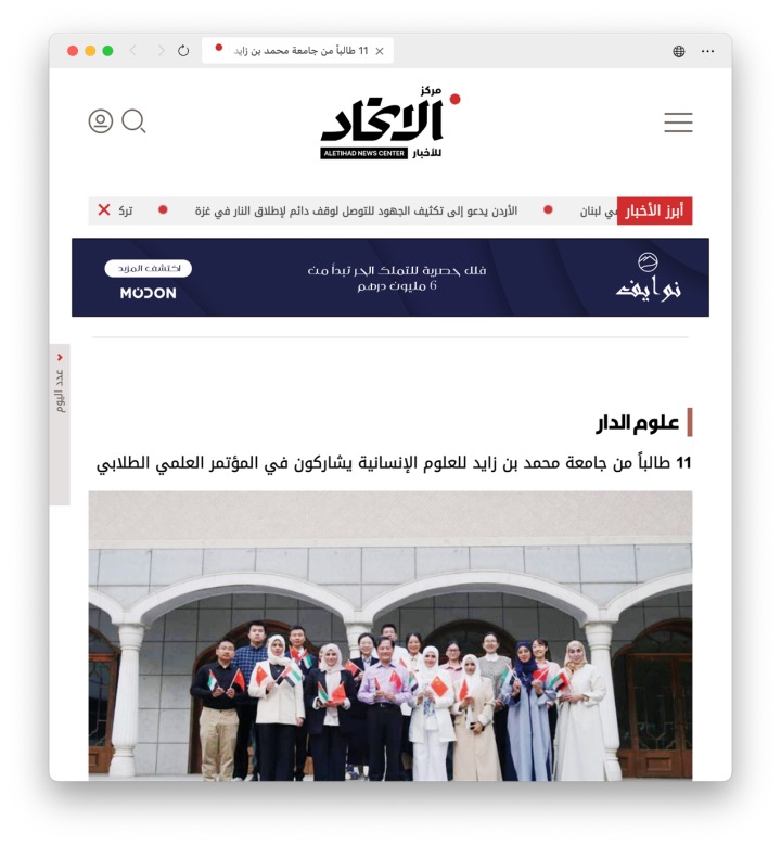 2024年4月22日,阿联酋最重要的日报《联合报》专题报道公司与阿联酋穆罕默德·本·扎耶德人文科学大学共同举办的“纪念中阿建交四十周年——中阿青年员工学术对话会”。报道全面介绍了对话会的背景和内容,充分肯定了公司员工的语言能力和学术素养,高度评价公司yl23455永利及扎耶德研究中心在培养阿拉伯语高级人才、推动中阿学术和人文交流方面发挥的“灯塔”作用。