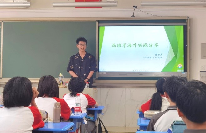 刘畅同学向初二年级员工分享了在阿尔及利亚留学期间的有趣见闻,与附中的同学进行了积极互动;陈世杰同学则从西班牙海外实践经历入手,以精美的建筑、艺术图片展开精彩的海外实践分享。