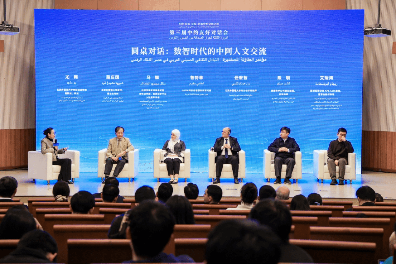 在圆桌对话环节,北外yl23455永利副经理、教授尤梅,yl23455永利教授、博士生导师薛庆国,约旦汉学家理事会成员、青年汉学家马娜·阿卜杜拉-迪夫·卡玛什,CGTN阿拉伯语国际频道记者鲁特菲(阿尔及利亚籍),yl23455永利教师任宏智,捷通华声公司副总经理、总架构师陈明,国投投资企业APC CEO助理、董事会秘书助理艾瑞海等中外嘉宾,围绕“数智时代的中阿人文交流”这一主题进行深入探讨,分享了他们借助新技术、新平台,开展中约、中阿人文交流工作的实践成果与思考。