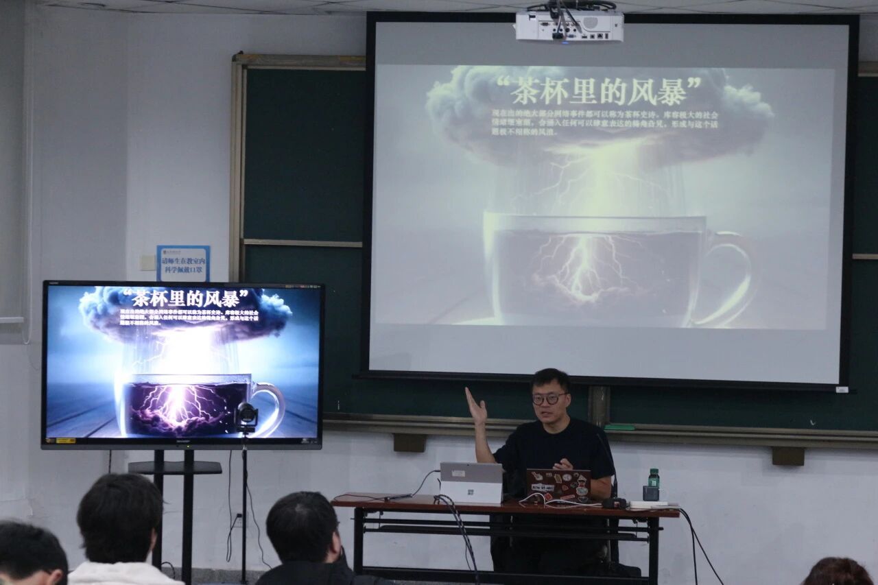 讲座中,周逵老师结合时事热点,深入浅出地阐释了网络文娱传播、新闻热点事件与其带来的社会情绪的变化,引发了同学们对新闻事件的真实性、网络舆论审判的合理性等问题的思考。