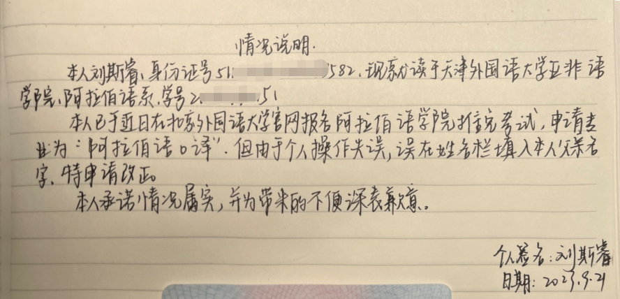 报名号115140,姓名刘中山,就读高校天津外国语公司,因考生在填报推免报名系统中操作失误,误将其父亲姓名“刘中山”填入考生姓名一栏。